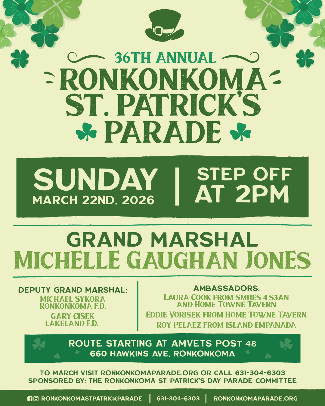 The 36th Annual Ronkonkoma St. Patrick’s Parade is Sunday, March 22nd, at 2PM! Join us as we celebrate the Luck of the Irish and march proudly down Hawkins Ave, honoring Grand Marshal Michelle Gaughan Jones.