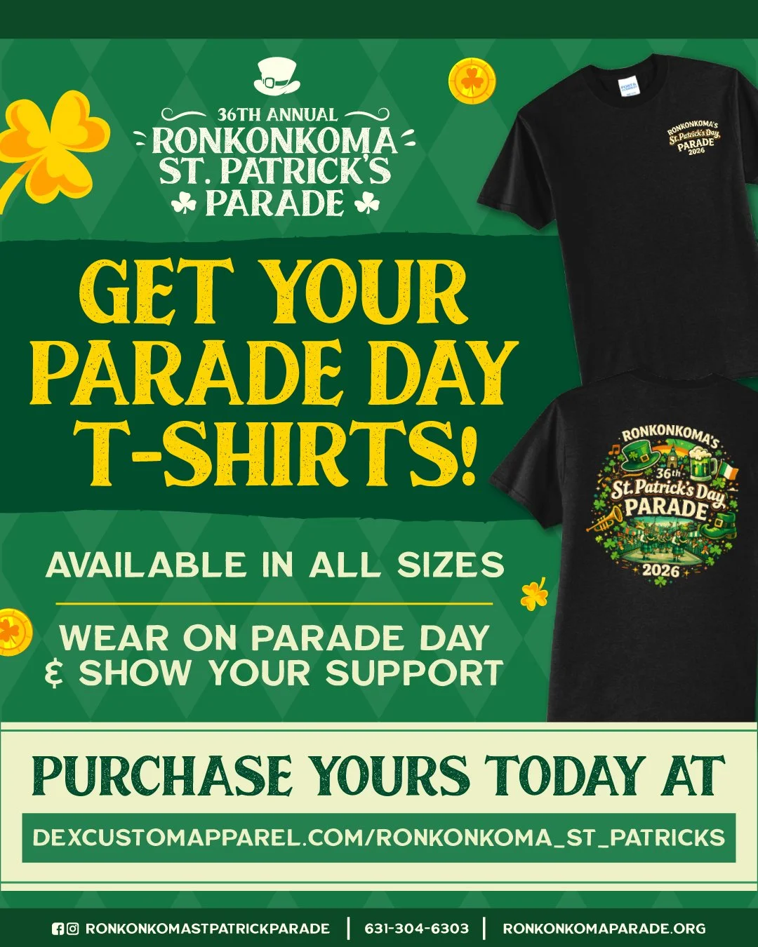 Purchase your 2026 Ronkonkoma St Patrick’s Parade Merch Now to show your Ronkonkoma Pride on Parade Day, March 22nd!